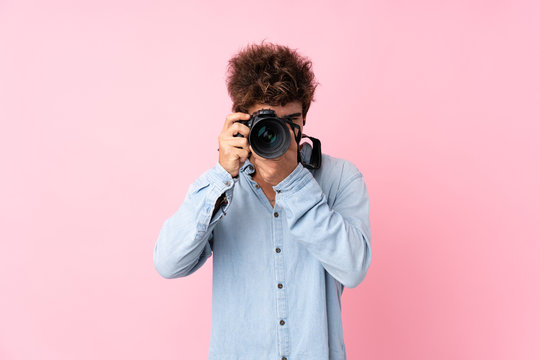Young caucasian man over isolated pink background with a professional camera