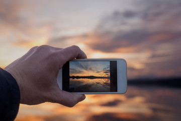Closeup shot of a man's hand taking a picture with a turned on mobile phone camera flashlight