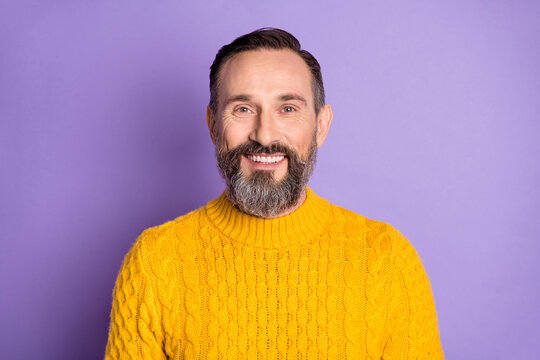 Portrait of satisfied person toothy smile look camera wear pullover isolated on purple color background