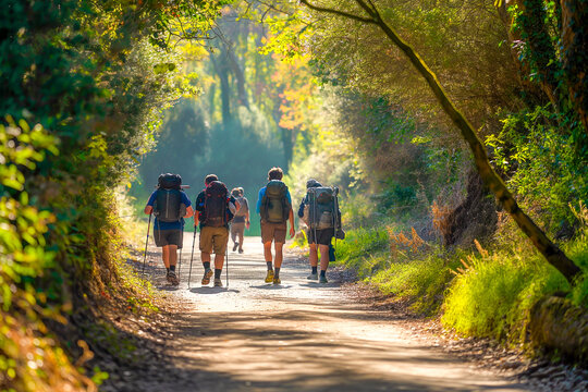 A group of pilgrims walking the camino de santiago at sunset. On a way to Santiago de Compostela.