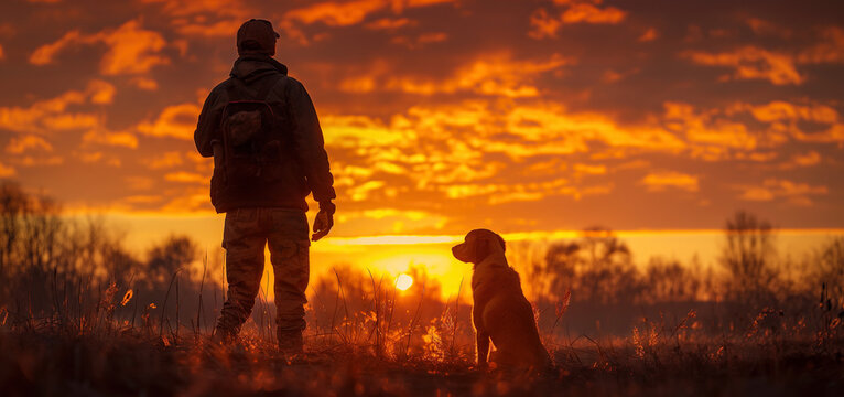 man hunter with dog in field in summer at morning sunrise against the background of forest hunting in nature