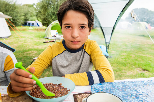 Boy eating breakfast at camp site