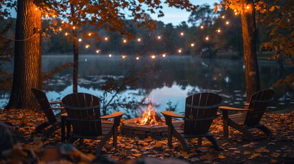 Picturesque campfire scene by lake with adirondack chairs image. Cozy autumnal ambiance. Fall nature retreat photography wallpaper. Relaxing spot. Ecotourism concept photorealistic photo