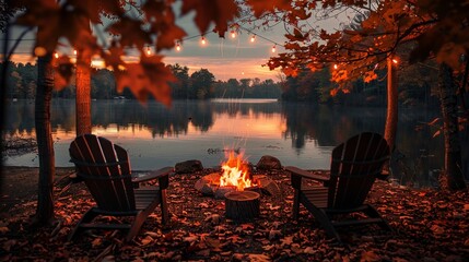 Adirondack chairs arranged around cozy lakeside campfire with string lights image. Fall nature retreat photography scene wallpaper. Relaxing spot. Ecotourism concept photorealistic photo