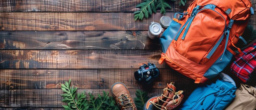 Outdoor camping and hiking essentials arranged on rustic wooden background, featuring backpack, boots, camera, and other gear.