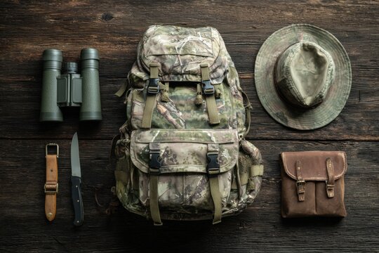 Outdoor adventure gear arrangement featuring camouflage backpack, binoculars, knife, leather pouch, and hat on rustic wooden background for exploration and travel enthusiasts