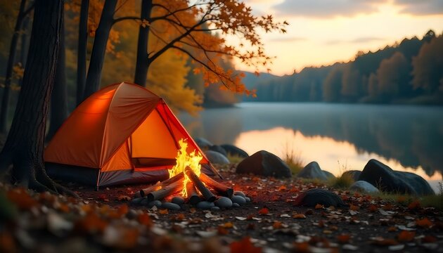 A cozy camping setup by a serene lake at dusk, featuring a stylish backpack and essentials