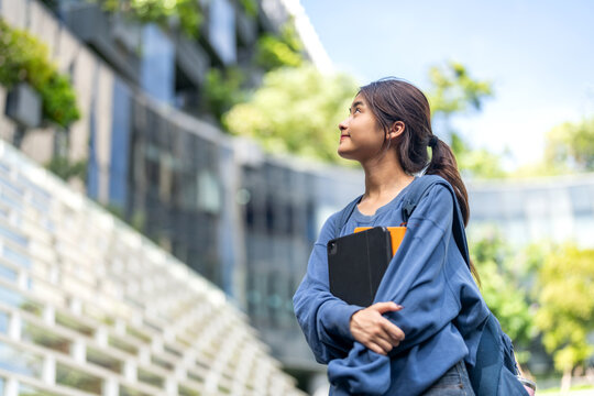 University student with backpack and tablet, campus life education journey, young asian woman ready for class, studying and learning, academic lifestyle college campus background, knowledge and growth