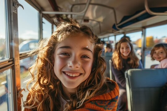 Cheerful child on school bus adventure excitedly approaching ticket machine