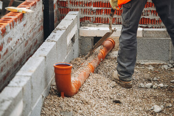 installation of a sewage plastic pipe during the construction of a house