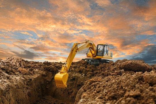 Selective focus ,Excavator with Bucket  are digging canalize the soil in the construction site on the sunset  background