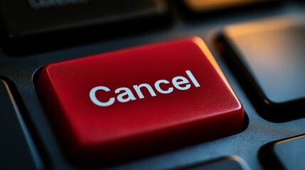 A dramatic close-up of a red "Cancel" button on a keyboard, symbolizing stopping, rejecting, or canceling an action. The lighting emphasizes the power and urgency behind the decision