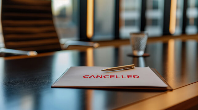 Cancelled Meeting Notice on Office Desk with Pen and Coffee in Corporate Environment