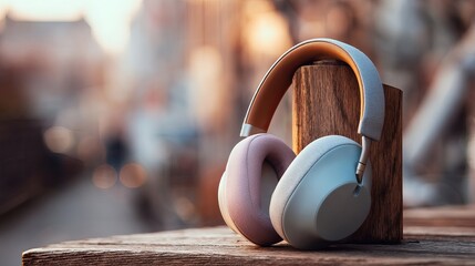 Experience pure sound with these stylish, modern over-ear headphones resting on rustic wood.