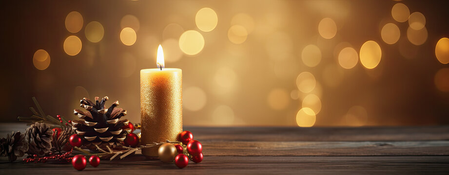 vela encendida  junto a decoración navideña de bolas, acebo y piñas, sobre mesa de madera con espacio vacio para productos comerciales  y fondo dorado desenfocado con bokeh brillante
