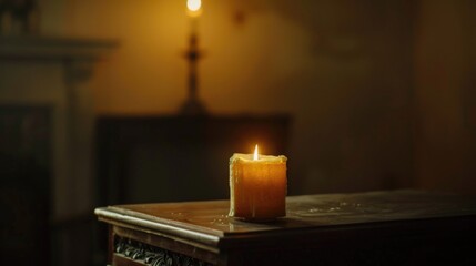 A single candle burns on a wooden table, casting a soft glow in a dimly lit, tranquil room.