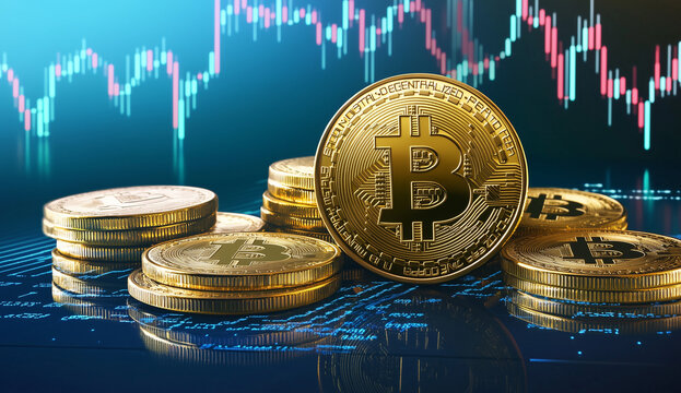 Bitcoin and Cryptocurrency concept, Stock market chart graph digital background, Gold Coins Against a Market Chart Backdrop, Trading graph, Bullish and Bearish candle stick graph chart