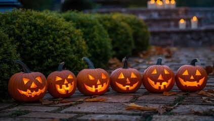 A row of glowing jackolanterns on a stone path with autumn leaves and candlelit steps