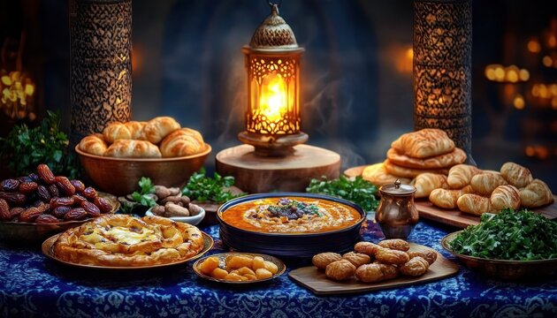 Cozy candlelit spread of Middle Eastern breads, pastries, dates, nuts, a hearty bowl of stew, fresh herbs and a small metal pot arranged around an ornate glowing lantern