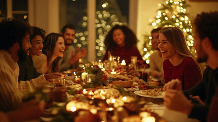Diverse group of friends enjoying festive dinner party, candlelit table with Christmas tree in background, warm and joyful holiday celebration