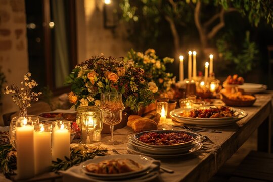 A candlelit evening showcases a romantic dinner table for two, featuring flickering candles, fine china, and delicate glassware for a cozy ambiance.