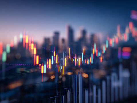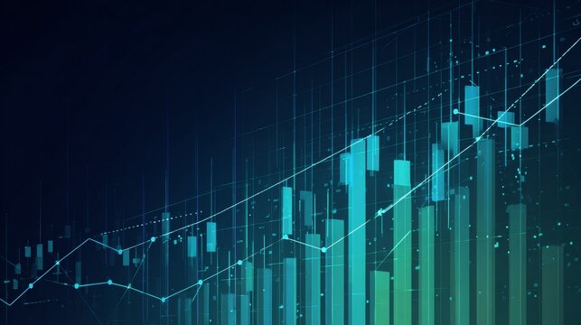 Futuristic abstract illustration of financial growth chart with candlestick patterns and bar graphs