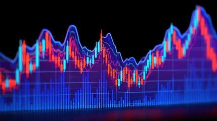 Colorful 3d bar chart visualizing financial data with neon candlestick grid overlay