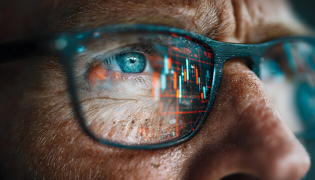 Person wears modern glasses. Stock market data, candlestick chart, reflects on lenses. Focused eye watches live trading trends. Investor analyzes tech finance, plans smart business decisions, manages
