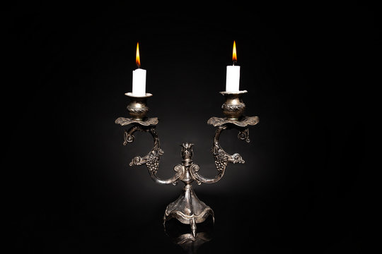 burning old candle vintage Silver bronze candlestick. Isolated Black Background.