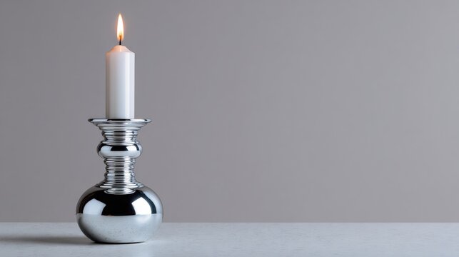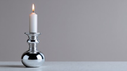Single white candle in a silver candlestick holder. the candle is lit and the flame is burning brightly. the holder is made of metal and has a cylindrical shape with a round base and a narrow neck.