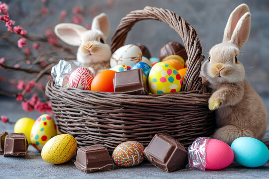 Adorable baby bunnies nestled in a wicker basket filled with colorful Easter eggs and chocolate treats