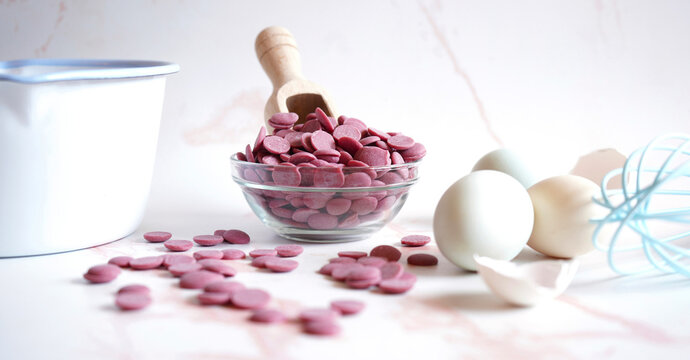 Ruby chocolate made from selected botanical cocoa bean varieties. Cooking concept with callet buttons banner.