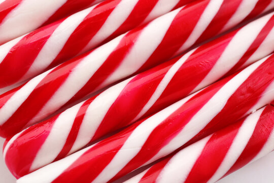Glistening red-white gummy candy resting among clear curved strands with crystal sugar