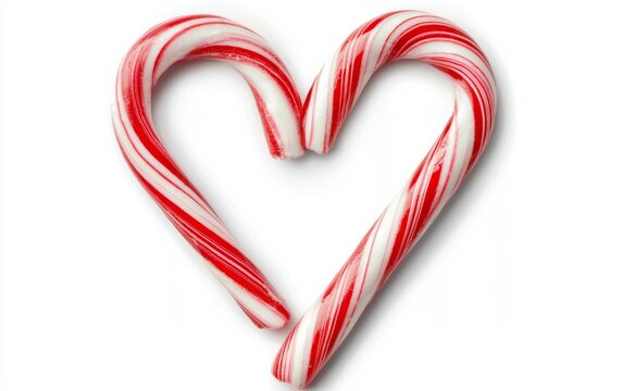 A candy cane heart formed by two candy canes, their stripes perfectly aligned, isolated on a white background