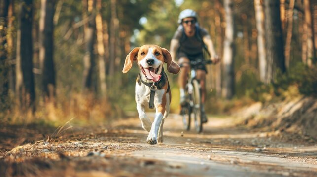 A beagle dog runs along a forest path ahead of a cyclist. Photography conveys a sense of freedom, activity and joy from walking together in the fresh air