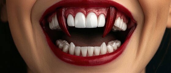 Closeup of a woman's mouth with vampire fangs and red lipstick