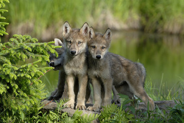 Wolf (Canis lupus) pups in deciduous woods, Minnesota, USA