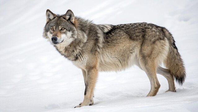 Closeup shot of a Canis lupus pambasileus in a snowy forest on a cold winter day