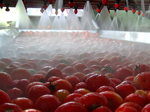 automatic working process of production of tomato fruits on assembly line to canned food on vegetable factory