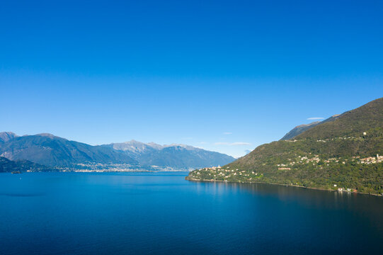 Wide view of Lake Maggiore with the hillside villages near Cannobio in northern Italy, framed by deep blue water and distant alpine peaks under a clear sky. The landscape features lush green slopes
