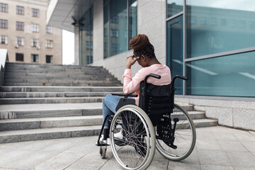 Unhappy young black woman suffering from lack of wheelchair friendly facilities, cannot get home without ramp, copy space. Inaccessible city environment for people with special needs concept