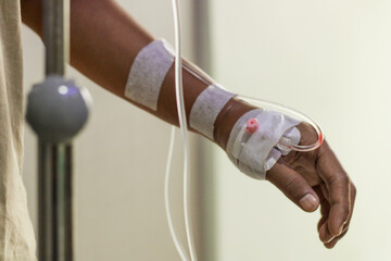 Patient arm with IV cannula and fingertip oximeter in hospital ward
