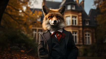 un renard futé anthropomorphique, comme un agent immobilier devant une maison bourgeoise