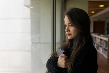 Pretty woman with book looking out window