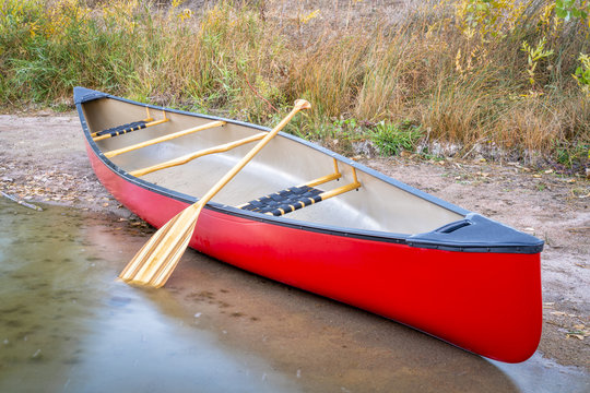 USA, Washington State, Cle Elum, Kittitas County. Red canoe on Cooper Lake.