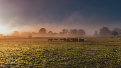 Salers cow in the morning fog in French Cantal