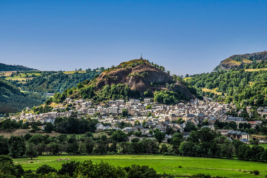 Vue sur Murat et le Rocher de Bonnevie, Cantal, Auvergne, France