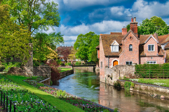 Canterbury, Kent, UK: Landscape of the Great Stour river running through old timbered houses near Westgate Gardens.