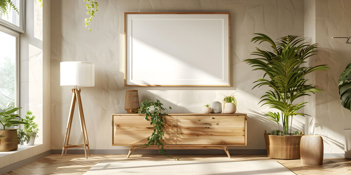 Wooden bedside table with horizontal large frame for wall art mockups. Modern rustic interior.