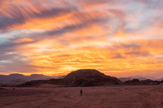 Person walking in desert near hill at sunset